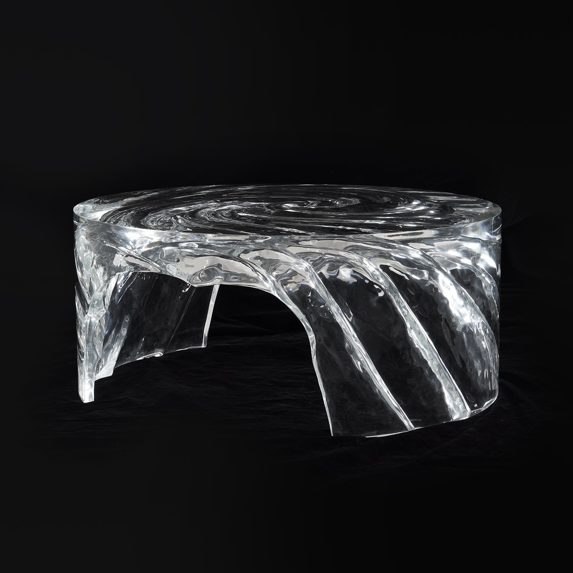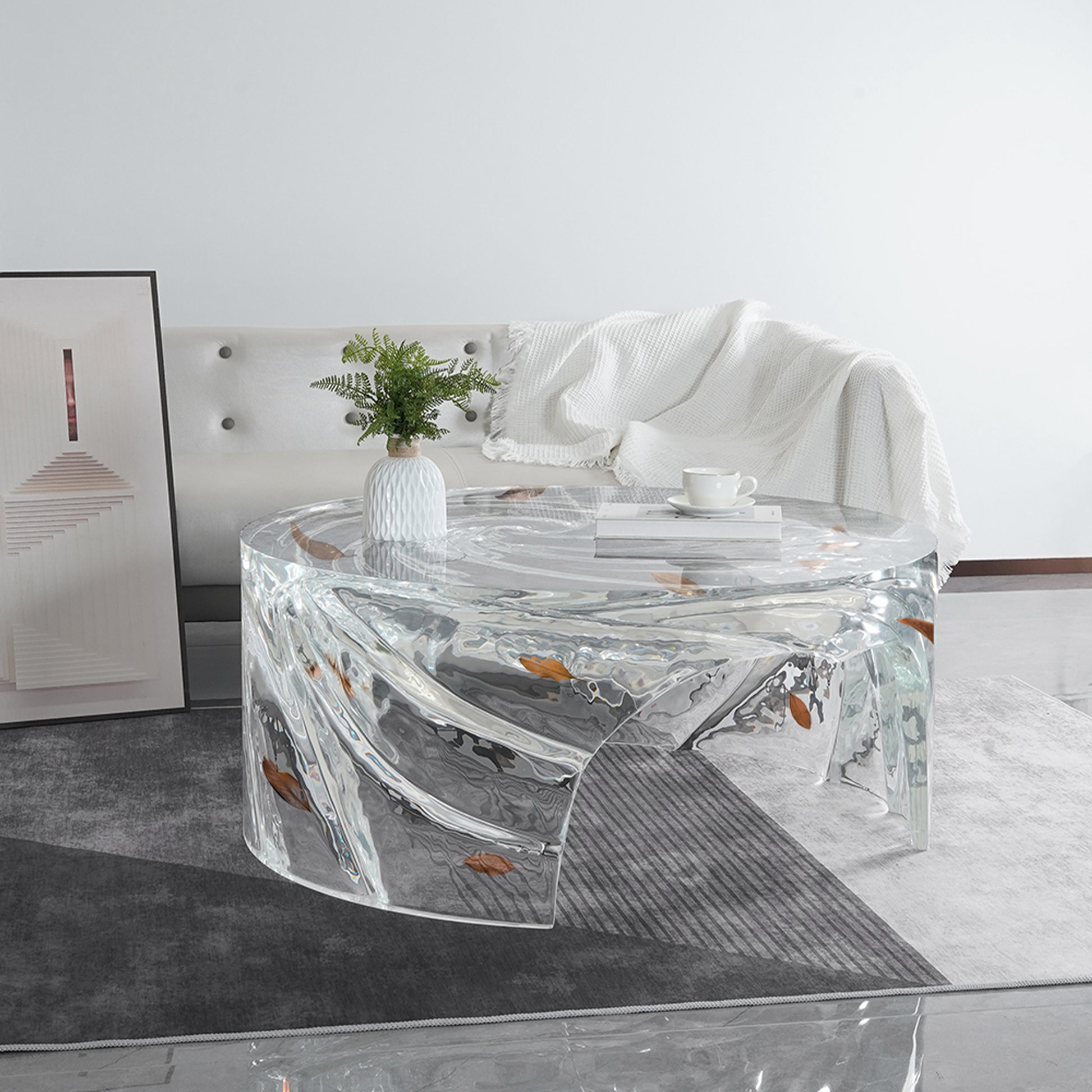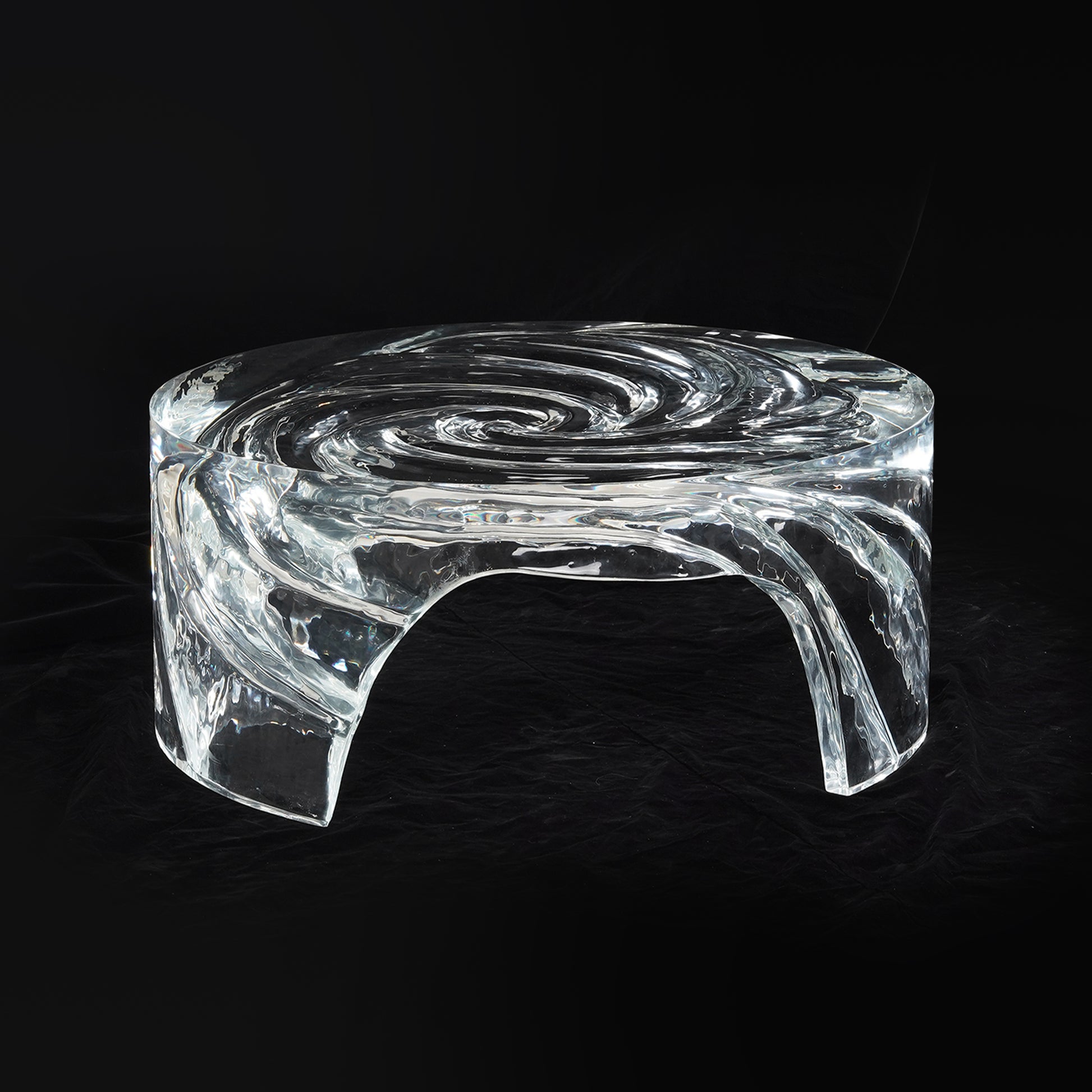Bring the dynamic beauty of swirling water into your living space with our Aqua Vortex Coffee Table. Handcrafted entirely from high-clarity material, this transparent table showcases intricate vortex patterns carved across its circular body, capturing the motion of swirling water in a bold yet sculptural form. The base features flowing legs that appear as if carved by water itself—creating a dynamic silhouette from every angle.
