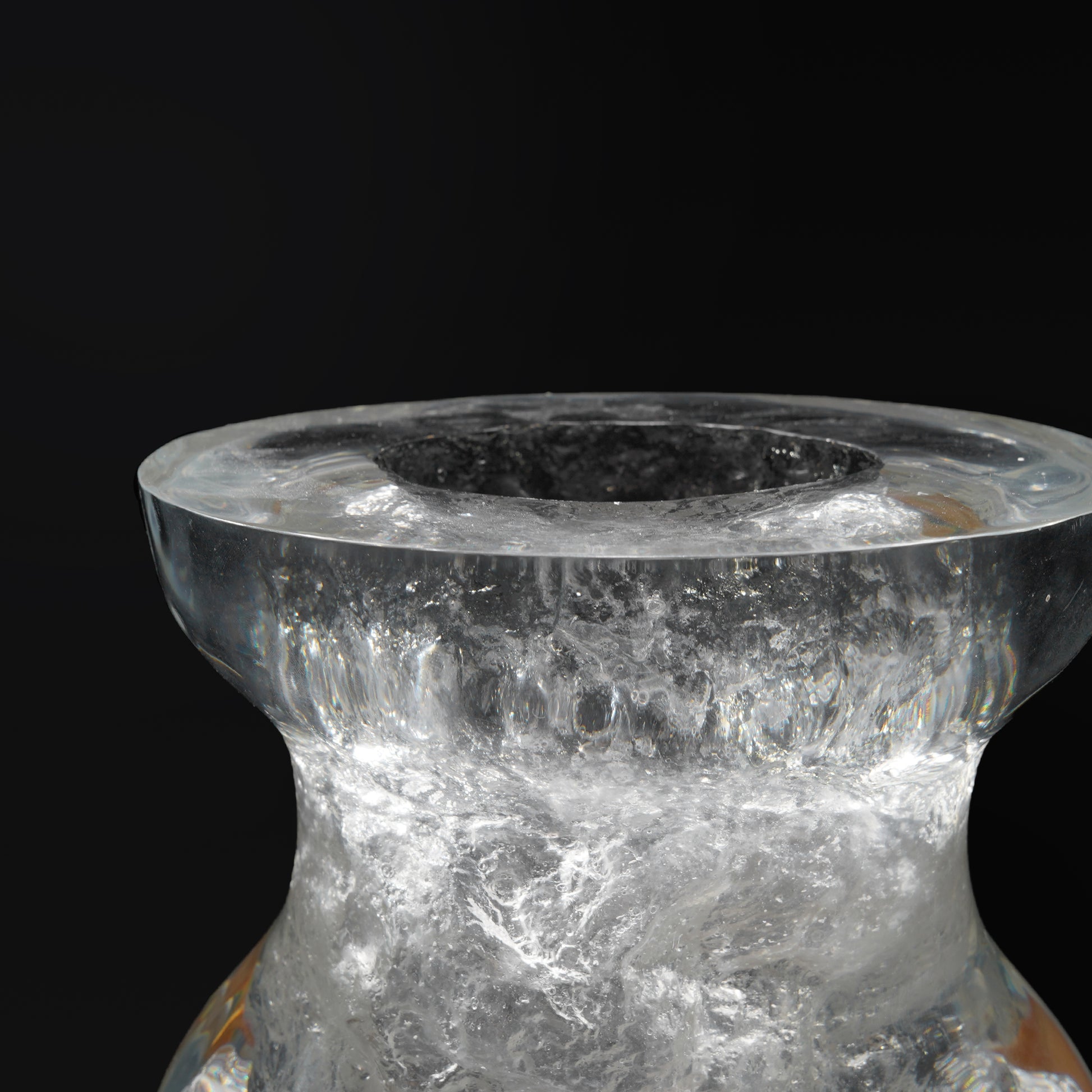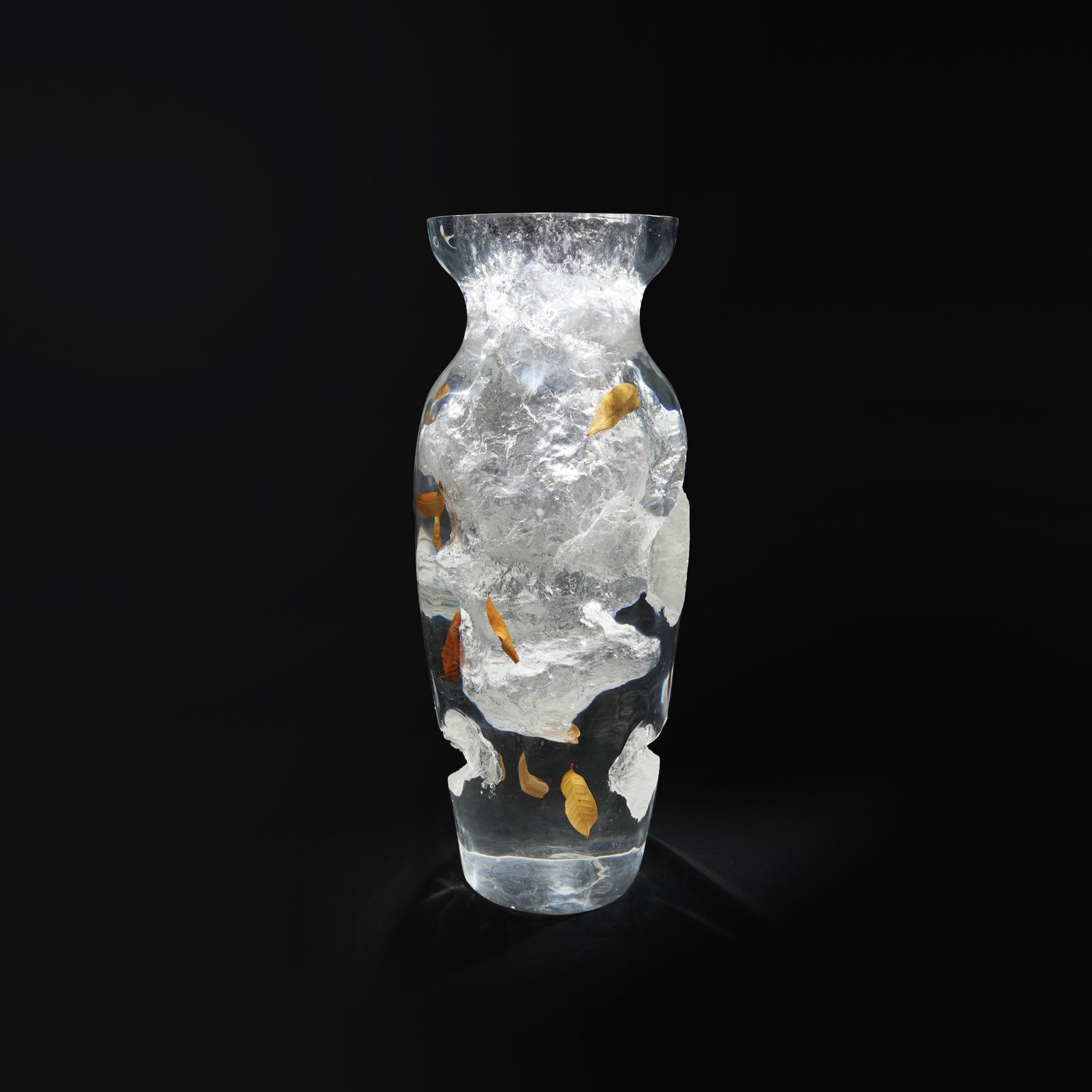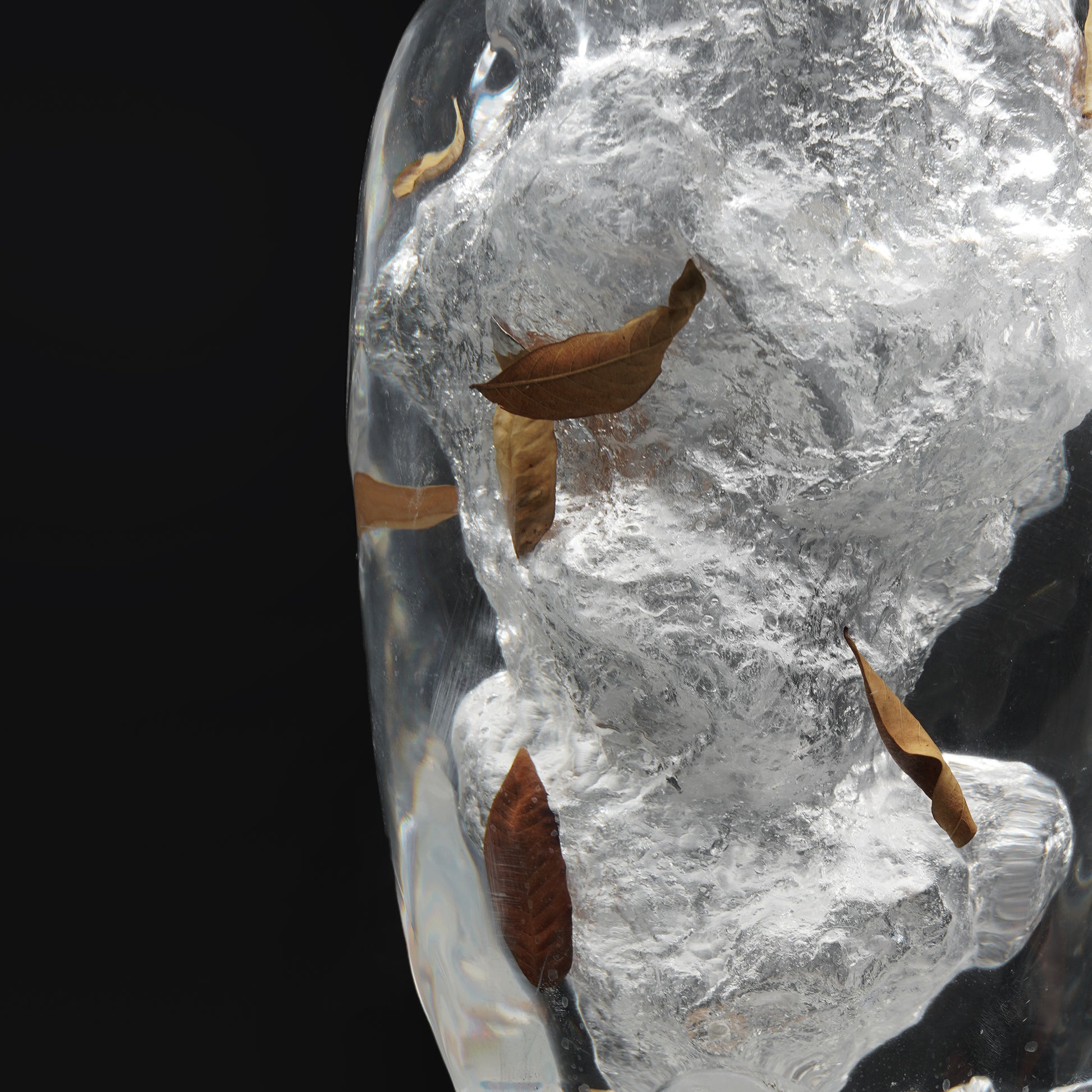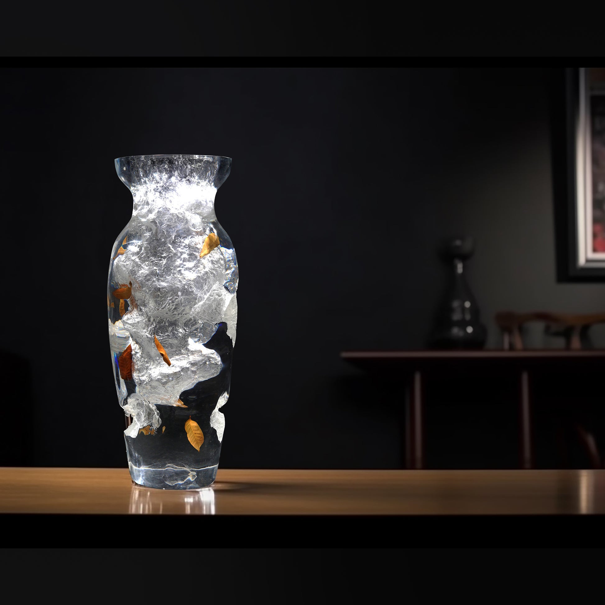 Crafted in a classic tall shape, this art vase explores nature’s raw beauty through a sculptural acrylic form. The interior features rugged voids and rough textures that mimic the natural erosion of rocks. Its slender silhouette offers an elegant, modern look, combining dried leaves float in a suspended moment to bring in a calm, contemplative ambiance.