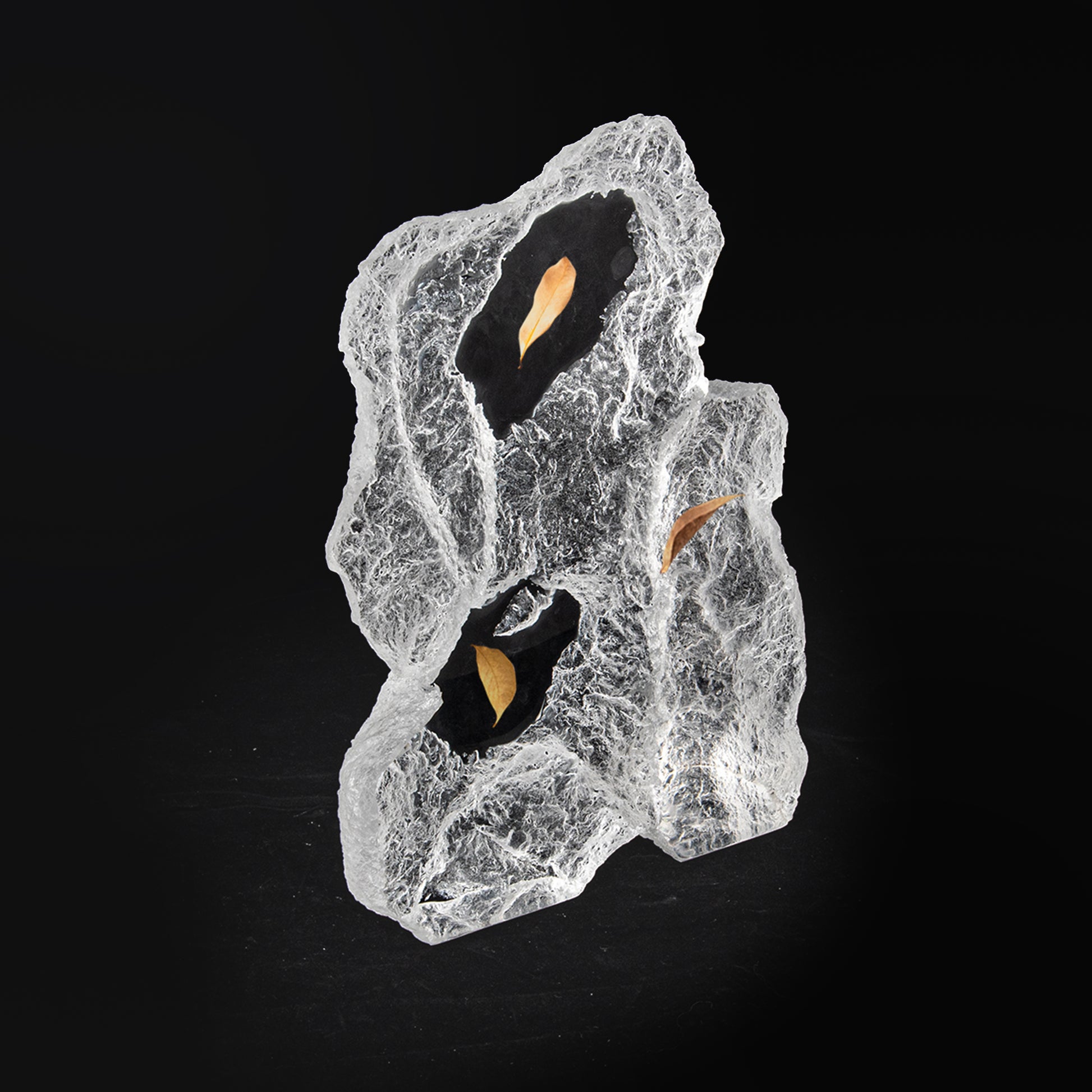 Each piece is handcrafted to emulates the raw, sacred beauty of mountains, embodying the harmony of nature and artistry. The preserved scattered leaves recreate the serene scene of leaves falling in the mountain forests. The use of clear material elevates the visual depth and ethereal ambient, capturing the quiet stillness of an untouched landscape and making it a fitting statement piece for Zen interior design.