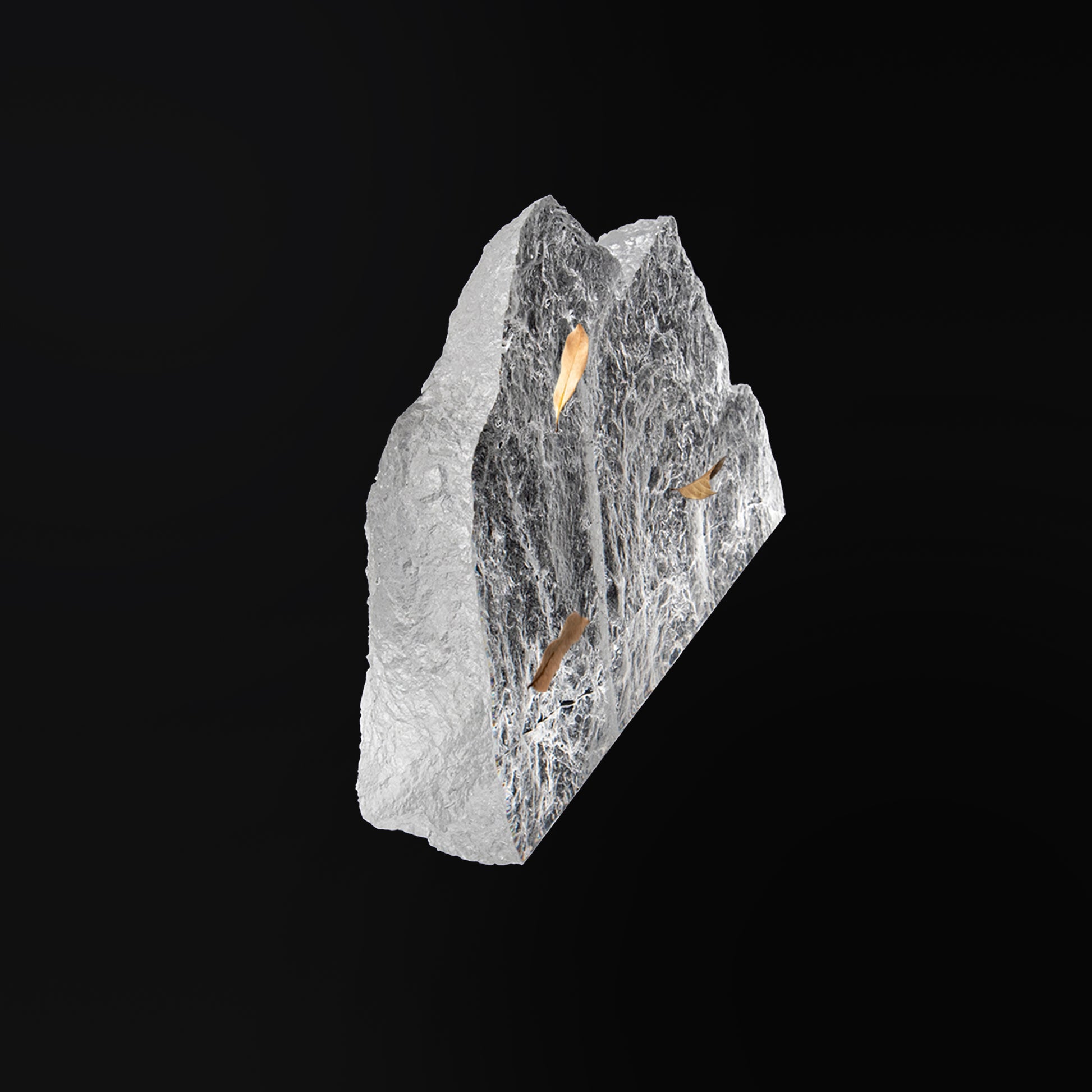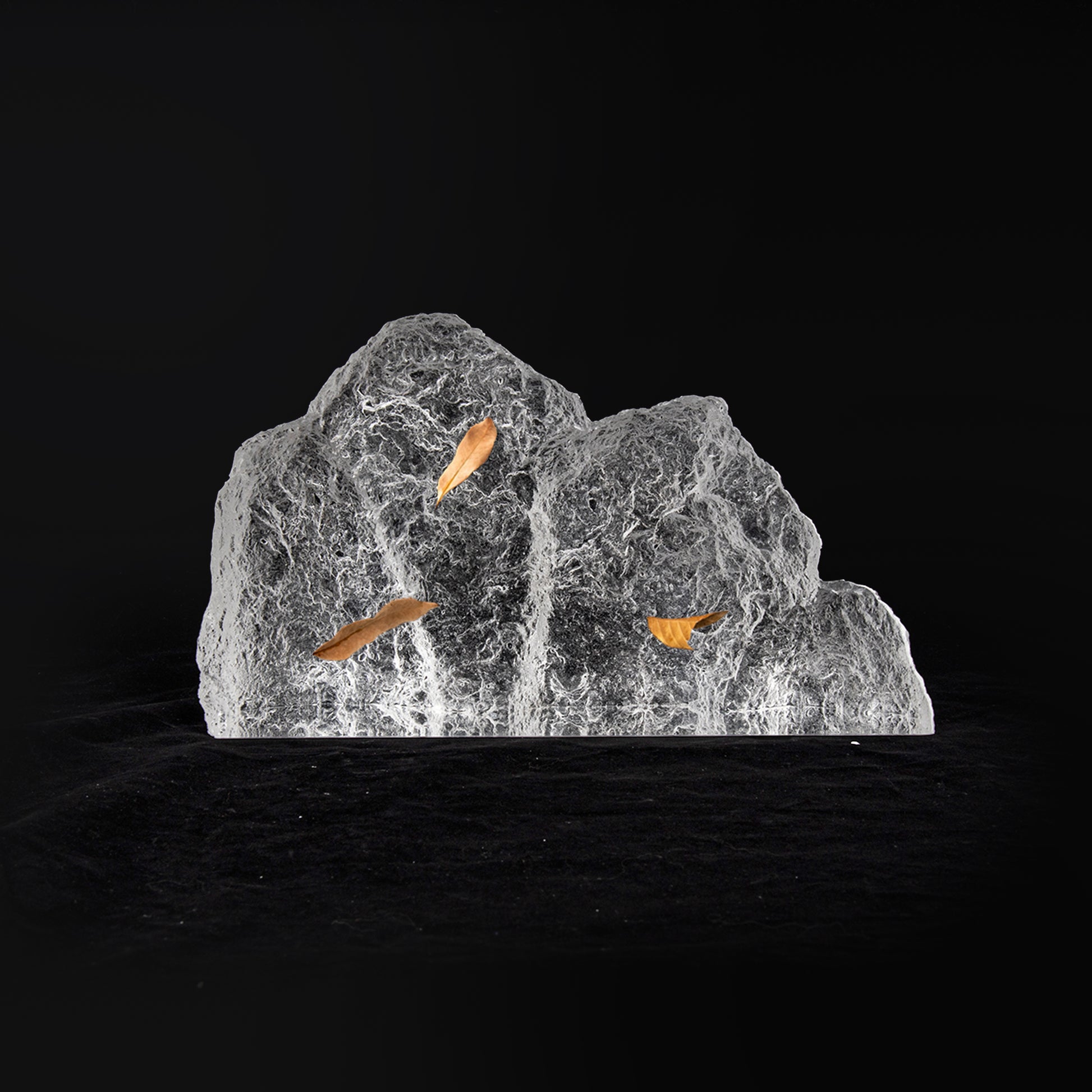 Each piece is handcrafted to emulates the raw, sacred beauty of mountains, embodying the harmony of nature and artistry. The preserved scattered leaves recreate the serene scene of leaves falling in the mountain forests. The use of clear material elevates the visual depth and ethereal ambient, capturing the quiet stillness of an untouched landscape and making it a fitting statement piece for Zen interior design.