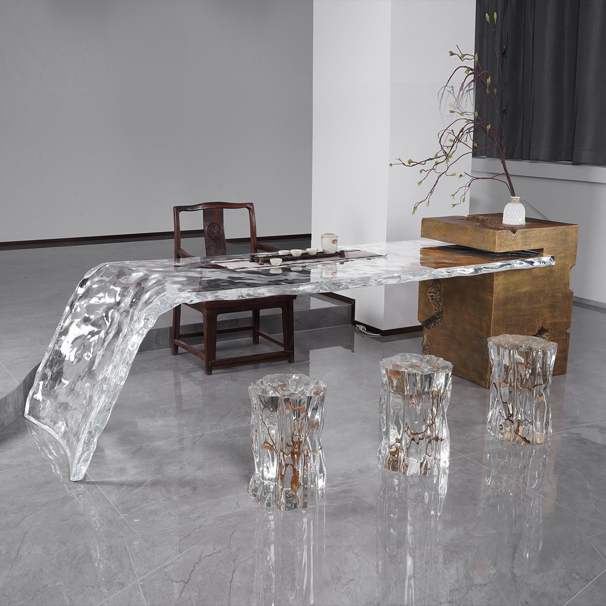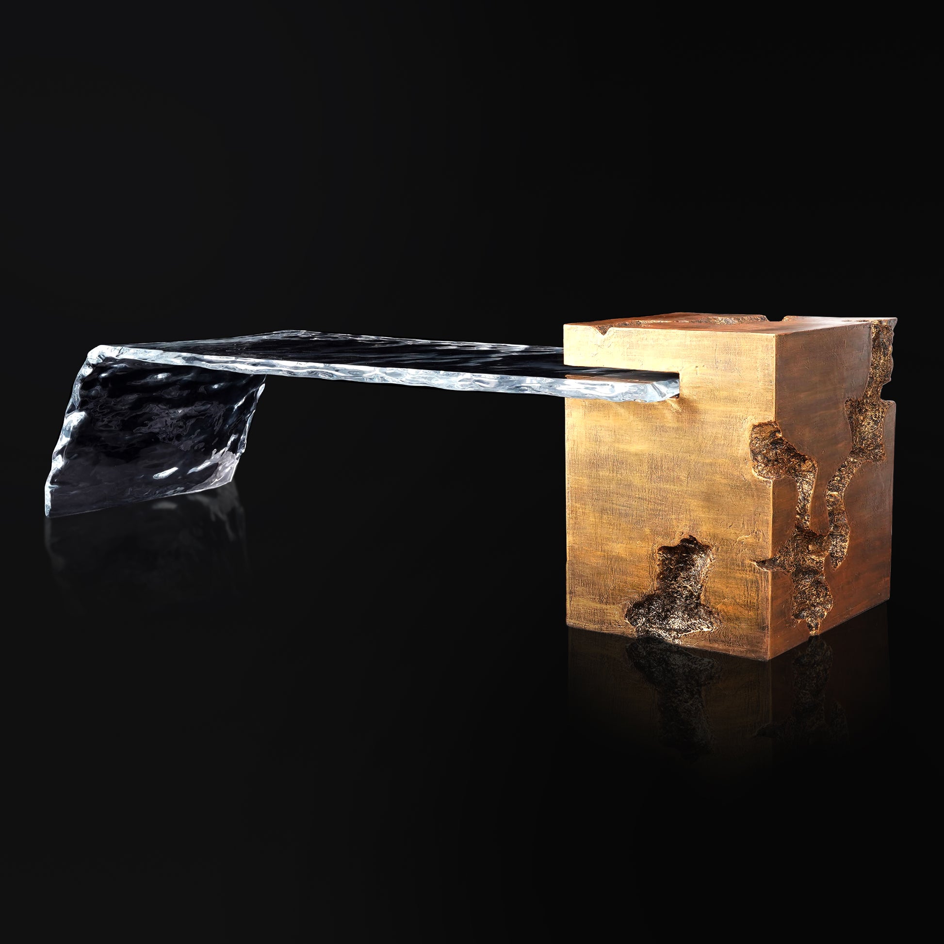 Bridging timeless spirit of oriental art with modern artistry, the Bronze Square Column River Flow Table is an ancient myth about the harmony of nature and time. The clear tabletop flows in a smooth, wave-like form, intricately carved to mimic a mountain stream frozen in motion. Paired with a square bronze base, aged with weathered textures, it evokes the beauty of natural erosion and the quiet power of time.
