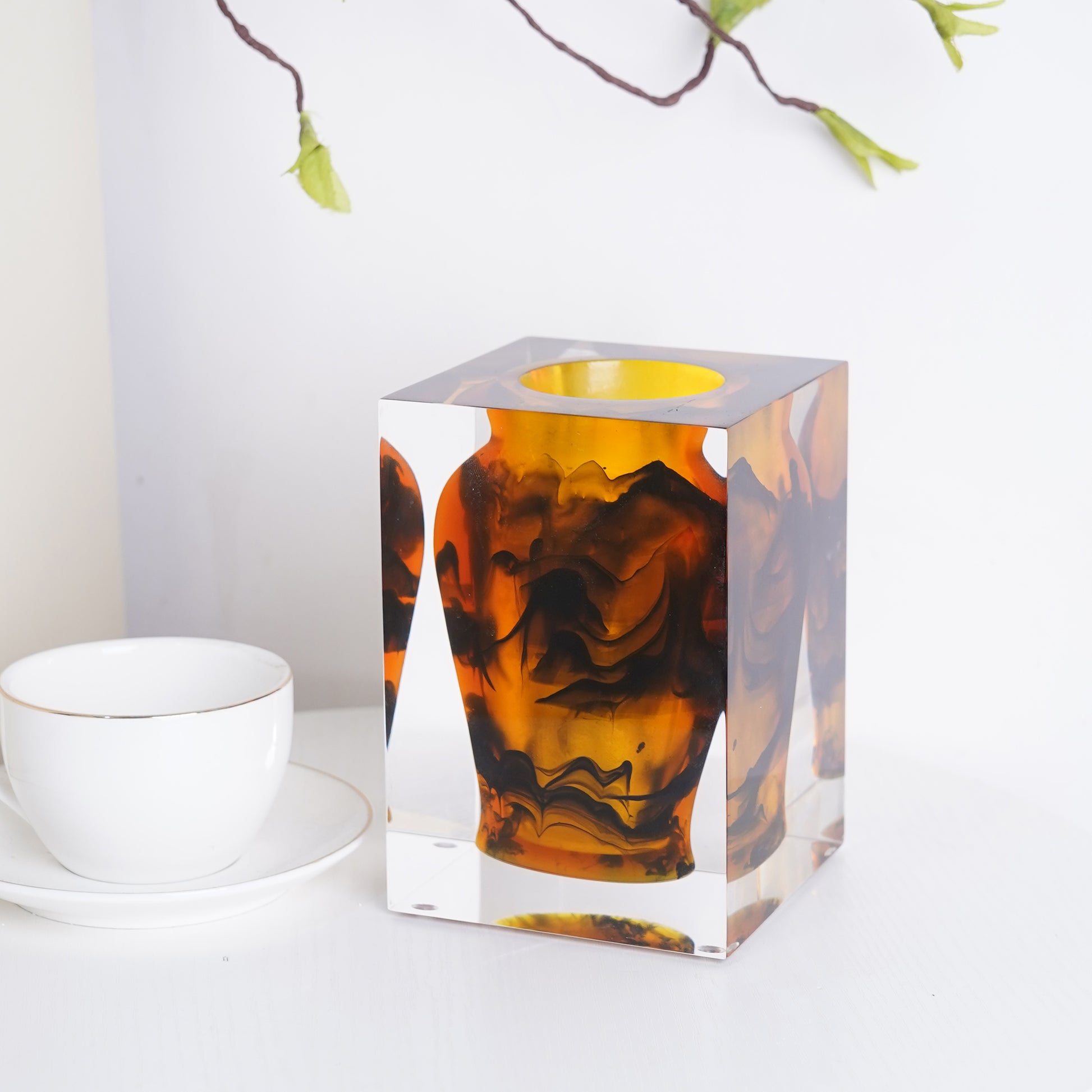 Meet the Ink Wash Series Vases — translucent amber-toned vases with smoky ink wash patterns that flow like brushstrokes suspended in air. The way it interacts the light brings out rich amber-golden tones, as if drawing natural glow of a mountain sunset scene. Encased in clear acrylic block, its oriental charms are framed in the moment, standing as a timeless artwork from ancient times.