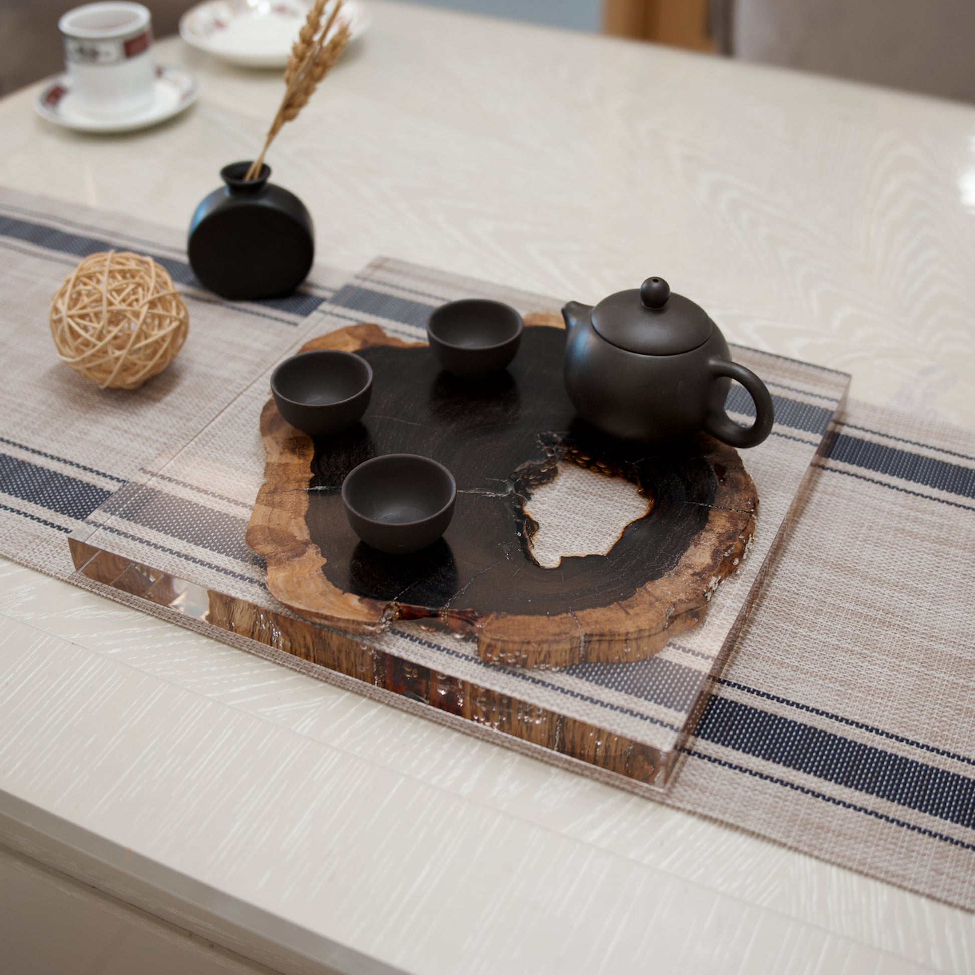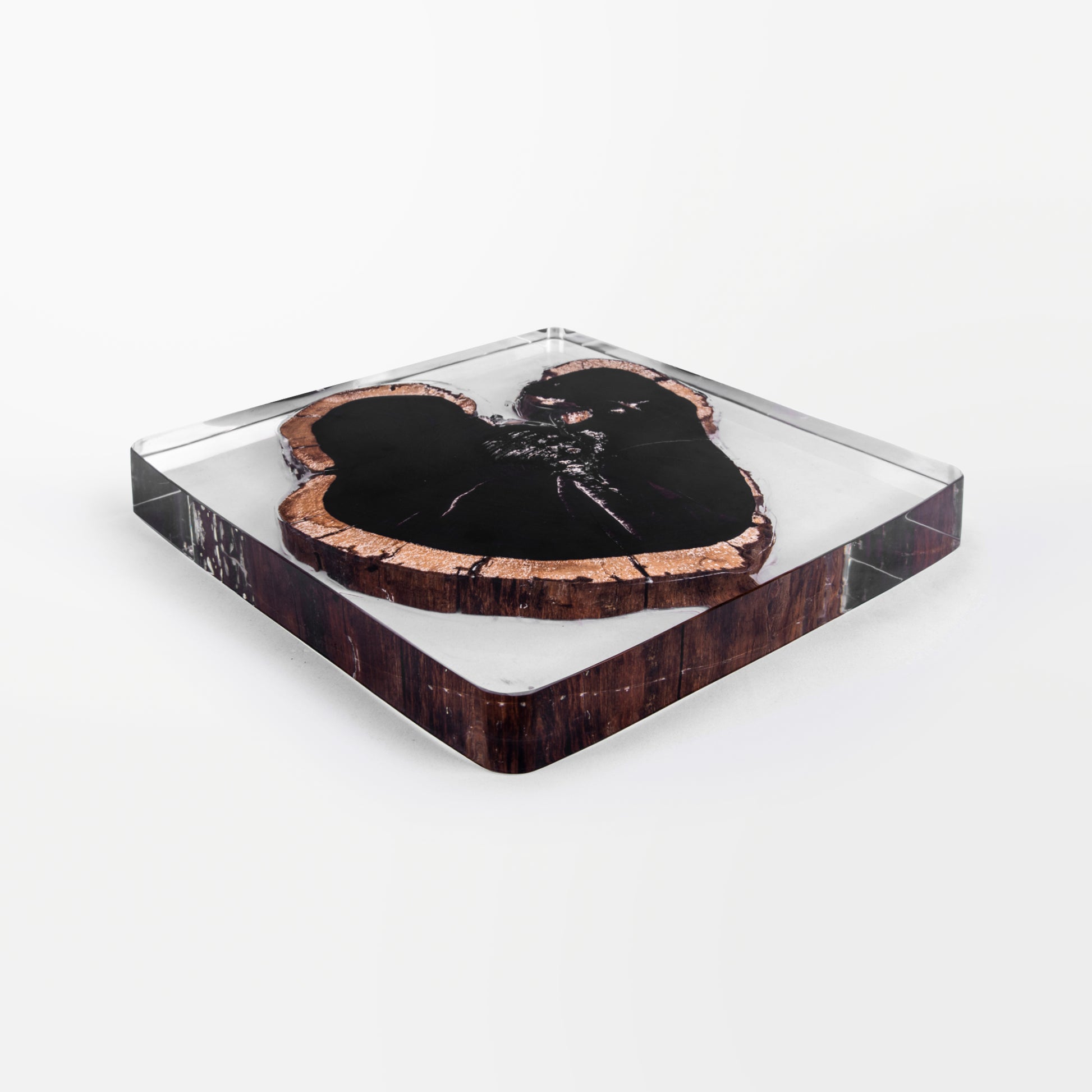 Captured within the crystal-clear acrylic square lies a raw piece of Ebony wood, its dark, rich tones creating a stunning contrast against the pristine transparency. The luxurious grain pattern of the Ebony piece becomes a visible artwork beneath the acrylic surface, providing a striking aesthetic that bridges rustic charm and contemporary sophistication. Lumière Creation's Ebony Wood tray is more than just a functional item; it's a testament to timeless beauty encased in modern design.