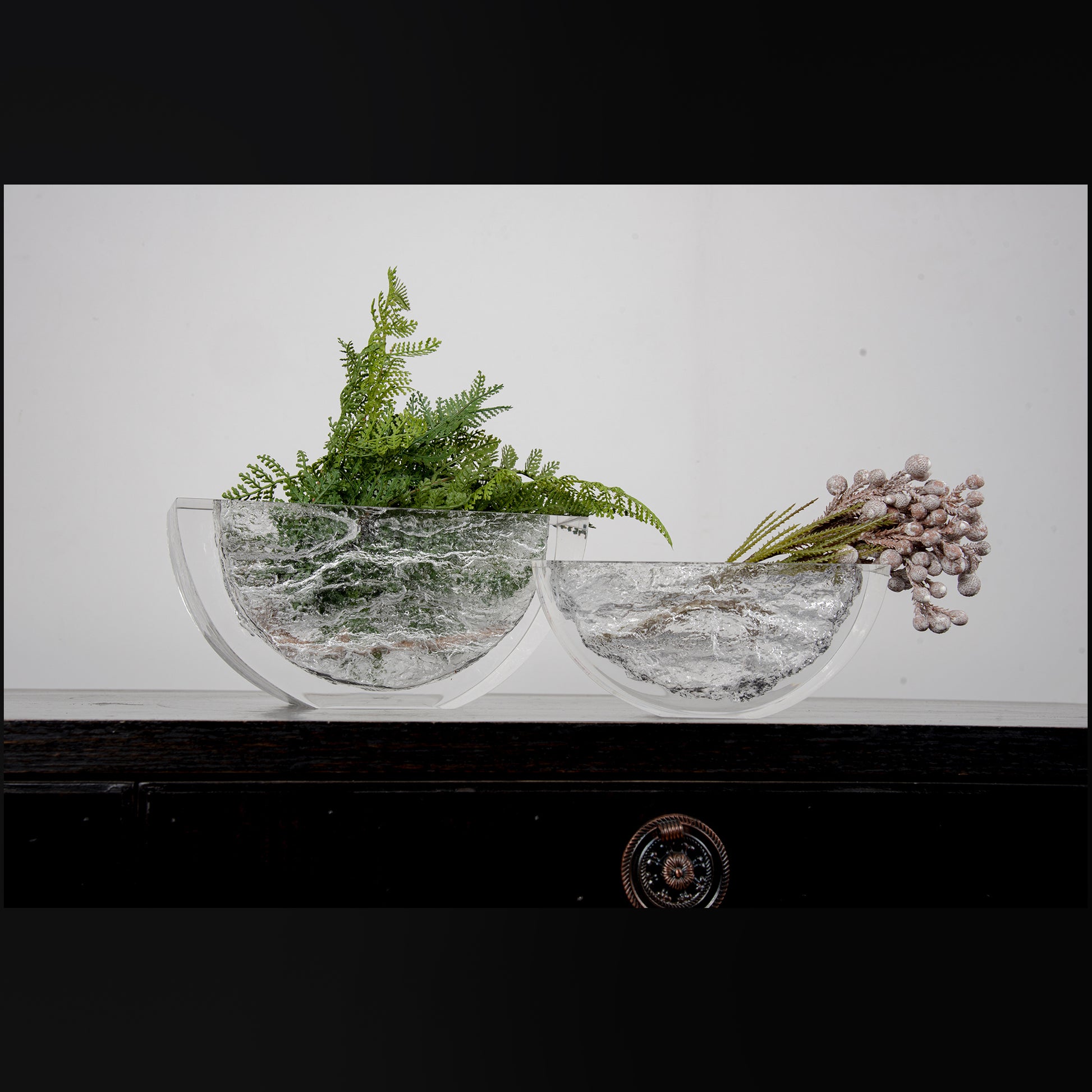 Inspired by glacial landscapes, this semi-circle vase captures nature's frozen wonders with exquisite artistry in sculptural form. The unique semi-circle silhouette, scupted with intricate ice-cracked interior texture that mimics the natural patterns of cracked ice. A modern rustic decor crafted to reflect nature’s elegance and strength, this home decor vase brings an extraordinary journey through frozen beauty into your home.