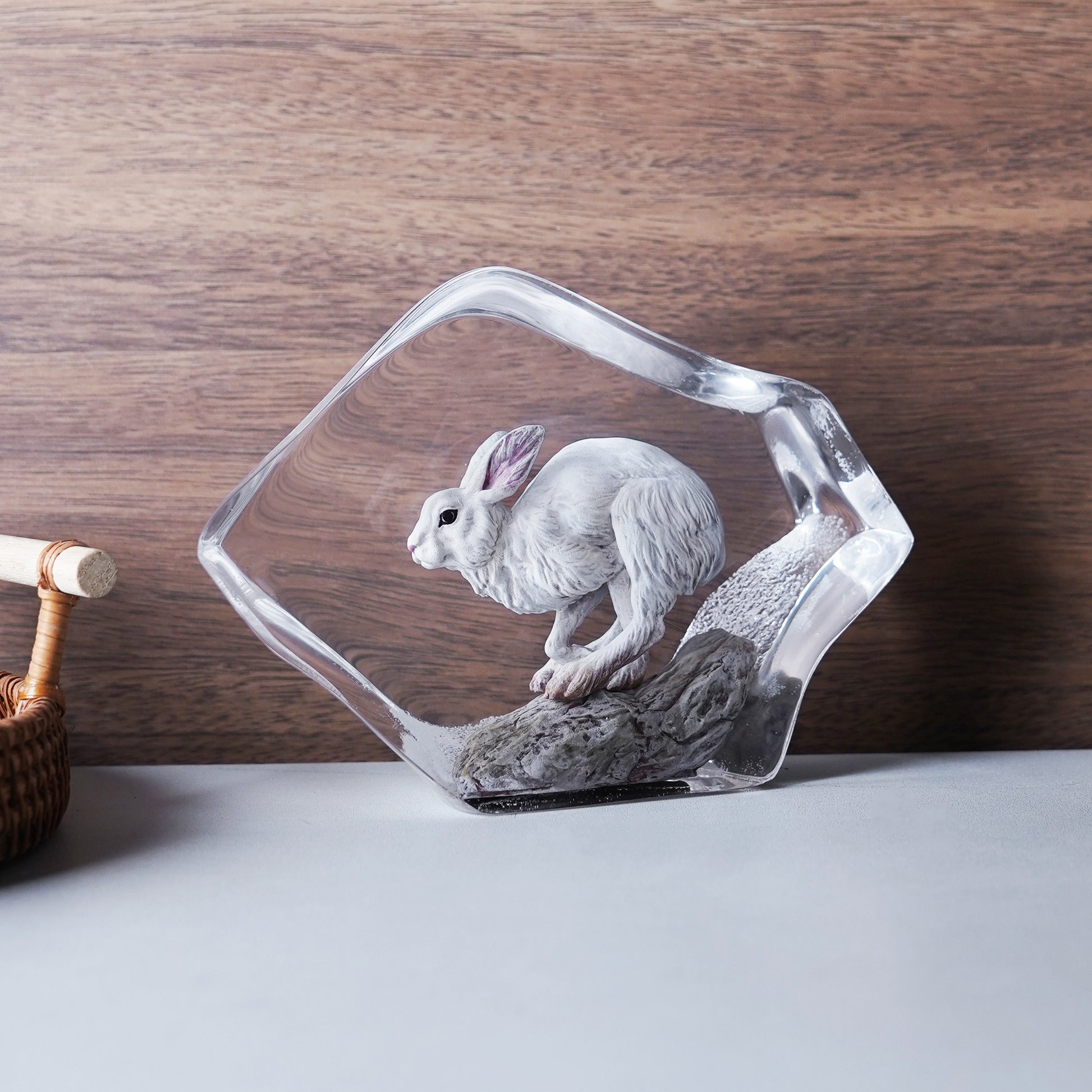 An artisan hand-sculpted and painted rabbit figurine, capturing delicate fur textures and a lifelike posture as it perches on a detailed rock base. The expressive stance adds charm and realism. The clear acrylic tablet introduces a modern aesthetic, while the rockery shape and subtle embossment enhance the wild, natural background, creating a harmonious blend of nature and contemporary design.