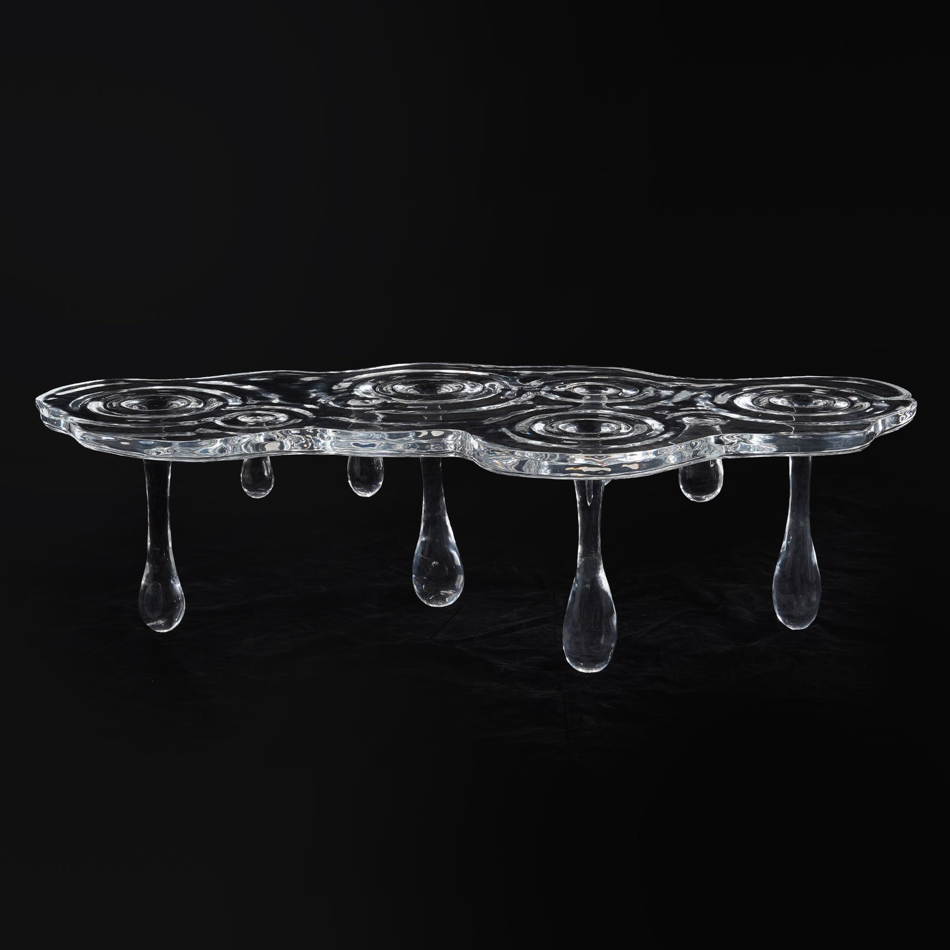 Bring the melody of water into your home with the Water Symphony Coffee Table. Inspired by the quiet rhythm of raindrops and ripples, this nature-inspired design is sculpted in crystal-clear material to resemble serene scene of a rainy night. The tabletop captures gentle concentric waves, while the droplet-shaped legs drip downward like suspended rain, creating an enchanting illusion of time paused.