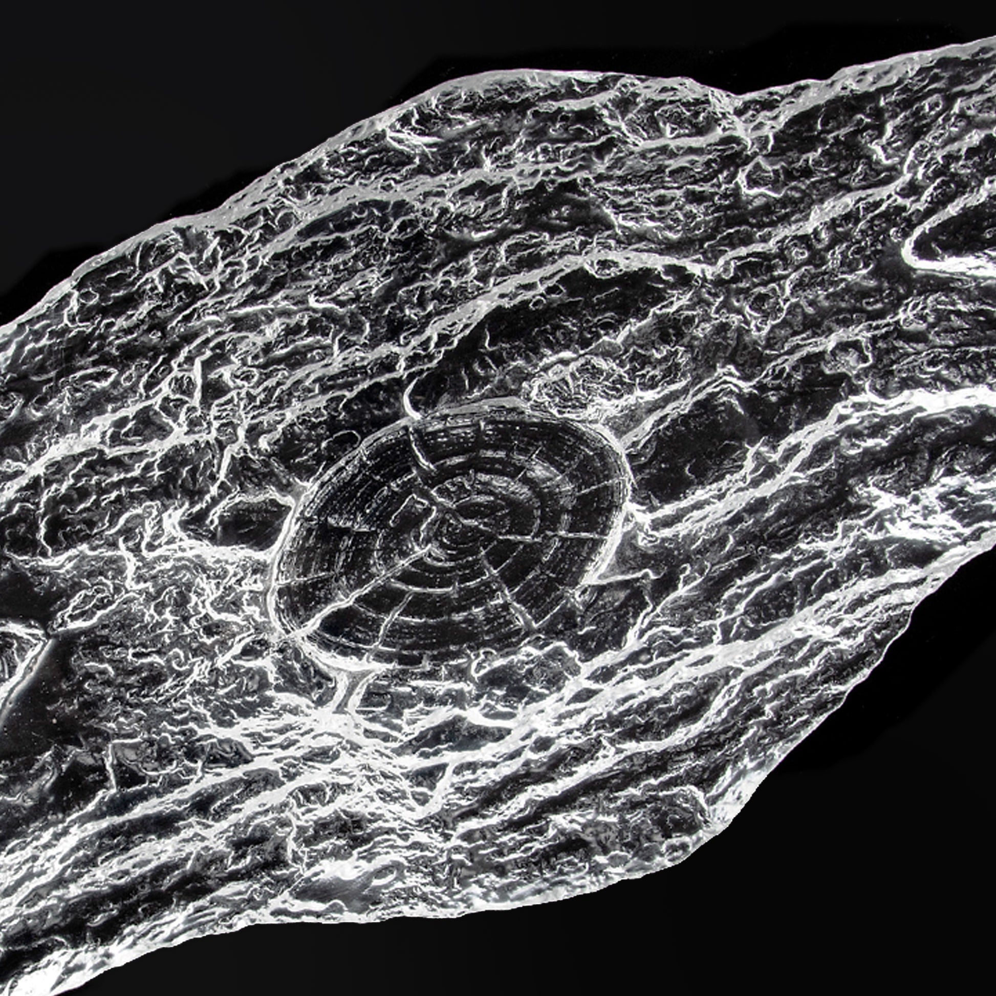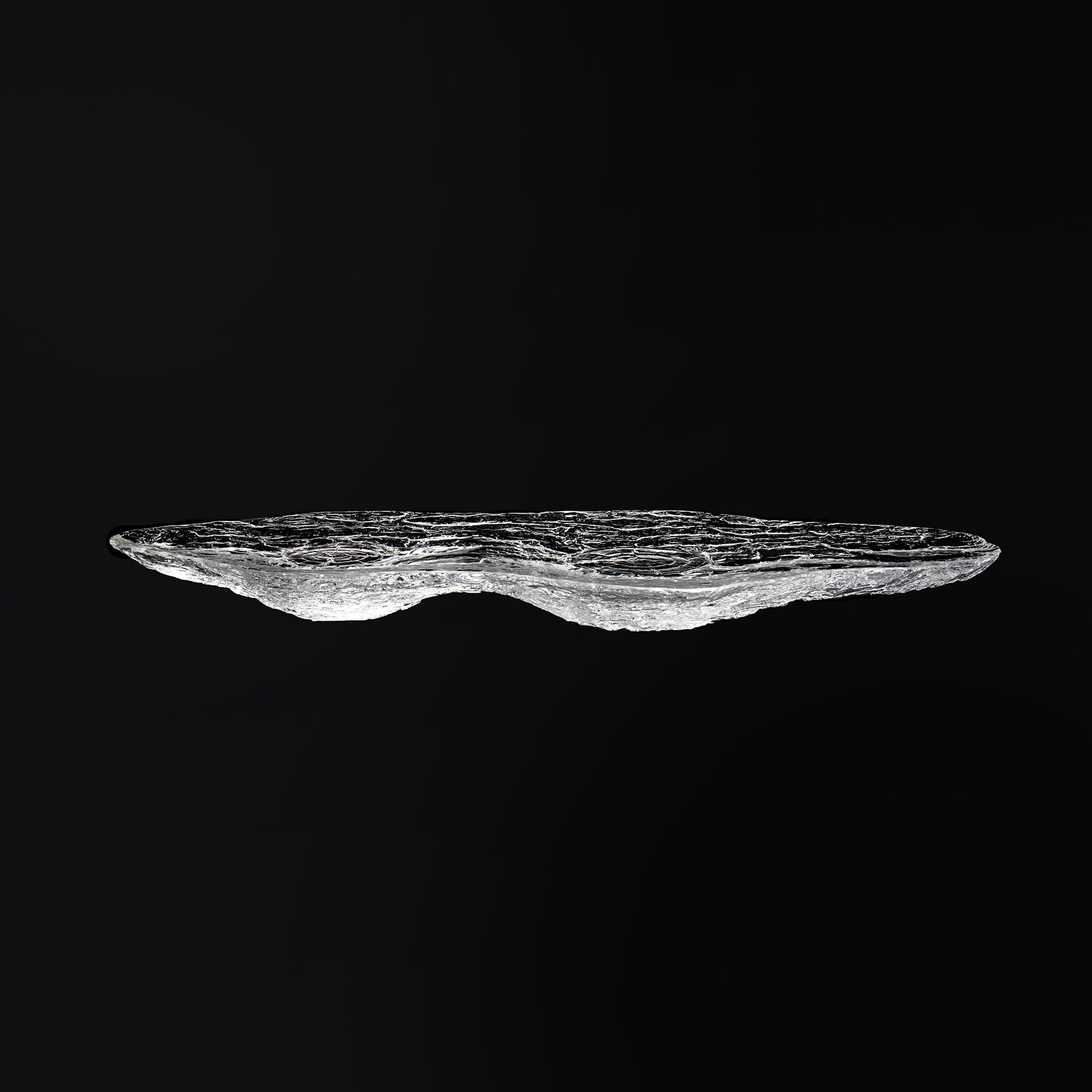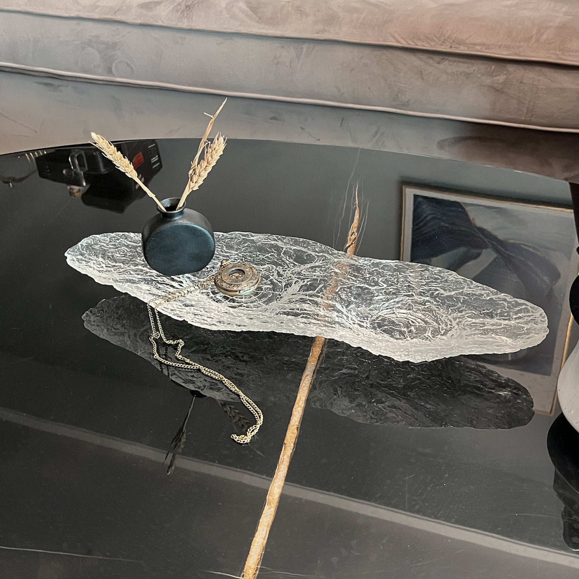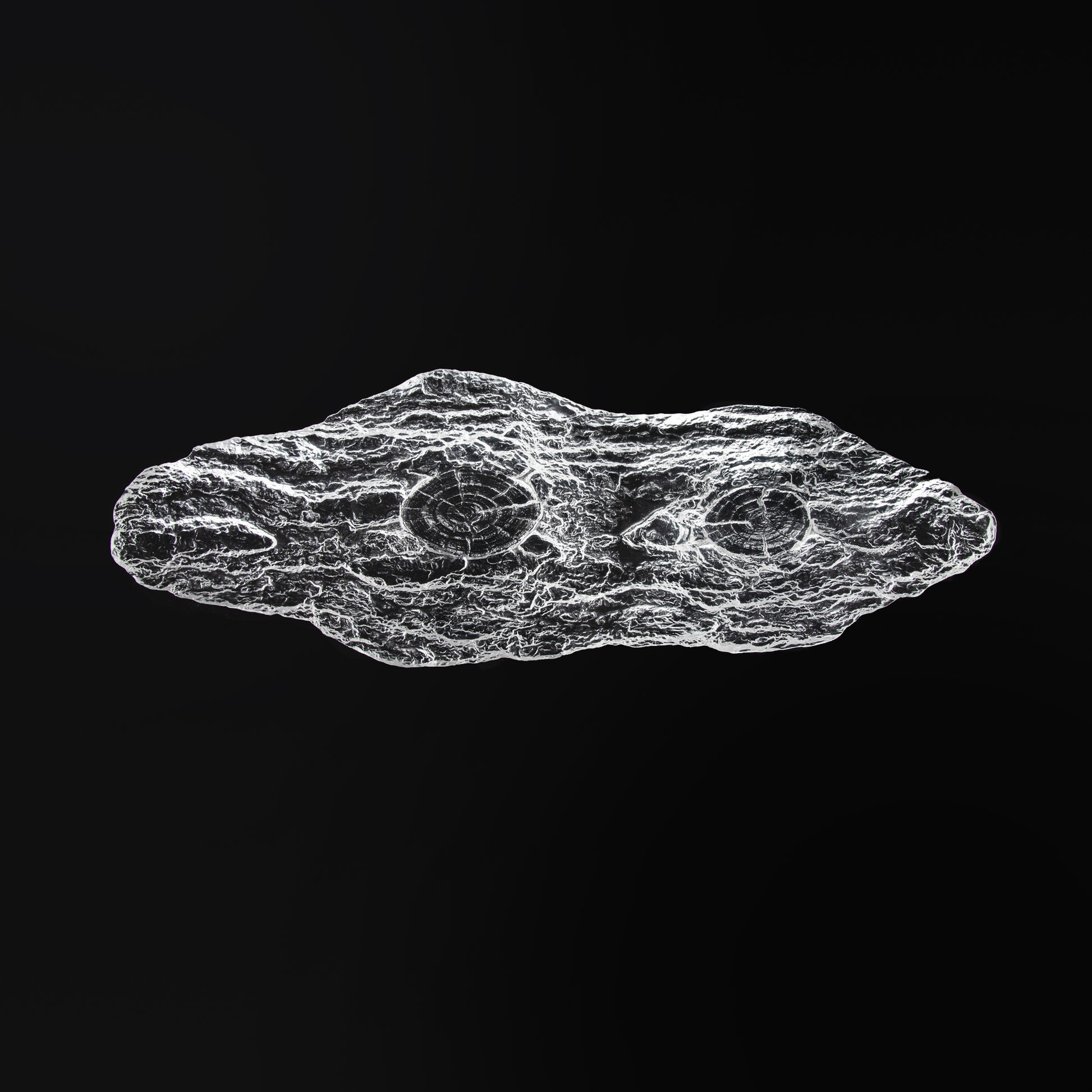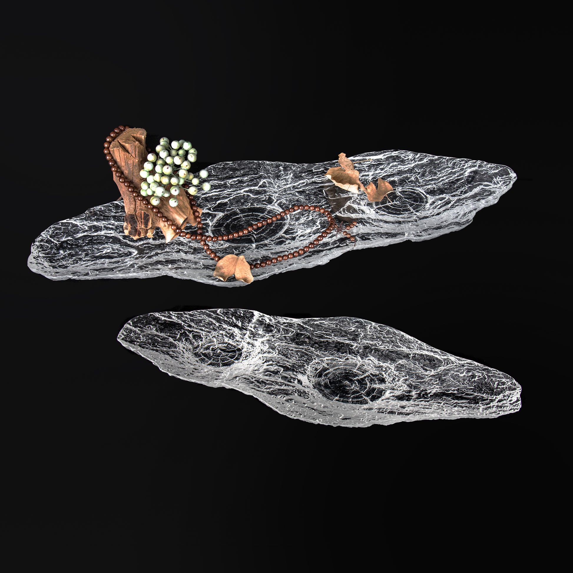 Experience nature's charm reimagined in this elongated transparent decorative stand, formed in the irregular silhouette of a wood bark piece, showcases a delicately textured base with carefully crafted bark texture at the bottom, forms a captivating tableau of forest tranquility. This unique piece fuses rustic natural elements with a clear modern aesthetic, creating a stunning focal point for any decor setting.
