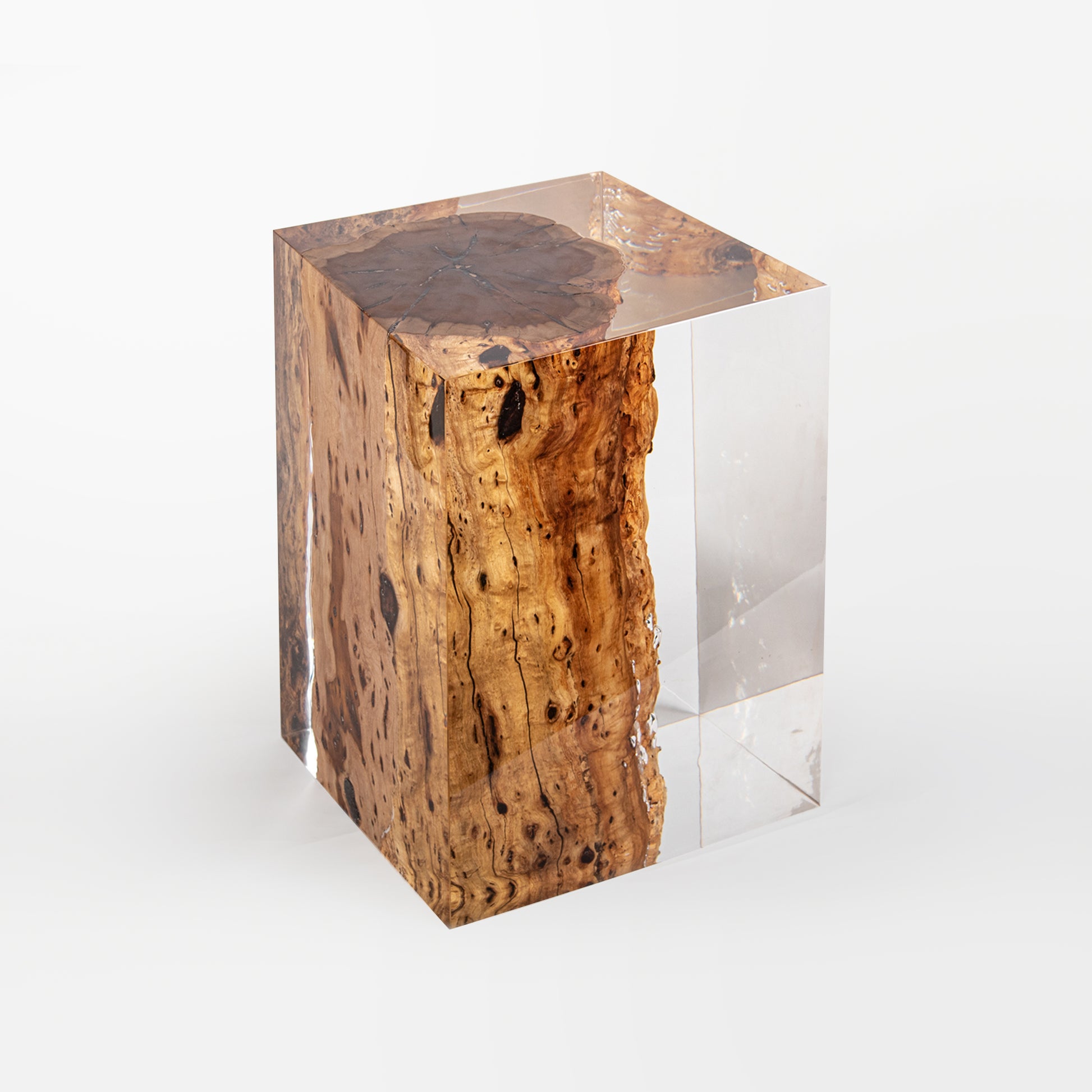 Encased in a crystal-clear acrylic block, the artisan transforms this rugged wood into a refined interior piece while preserving its wild, luxurious beauty. It’s designed to complement a wide range of interiors—from vintage farmhouse furniture to luxury interior design. Whether styled as a side table or accent stool, this Asian table stands as an eye-catching centerpiece, bringing exotic aesthetics and cultural roots into any interior.