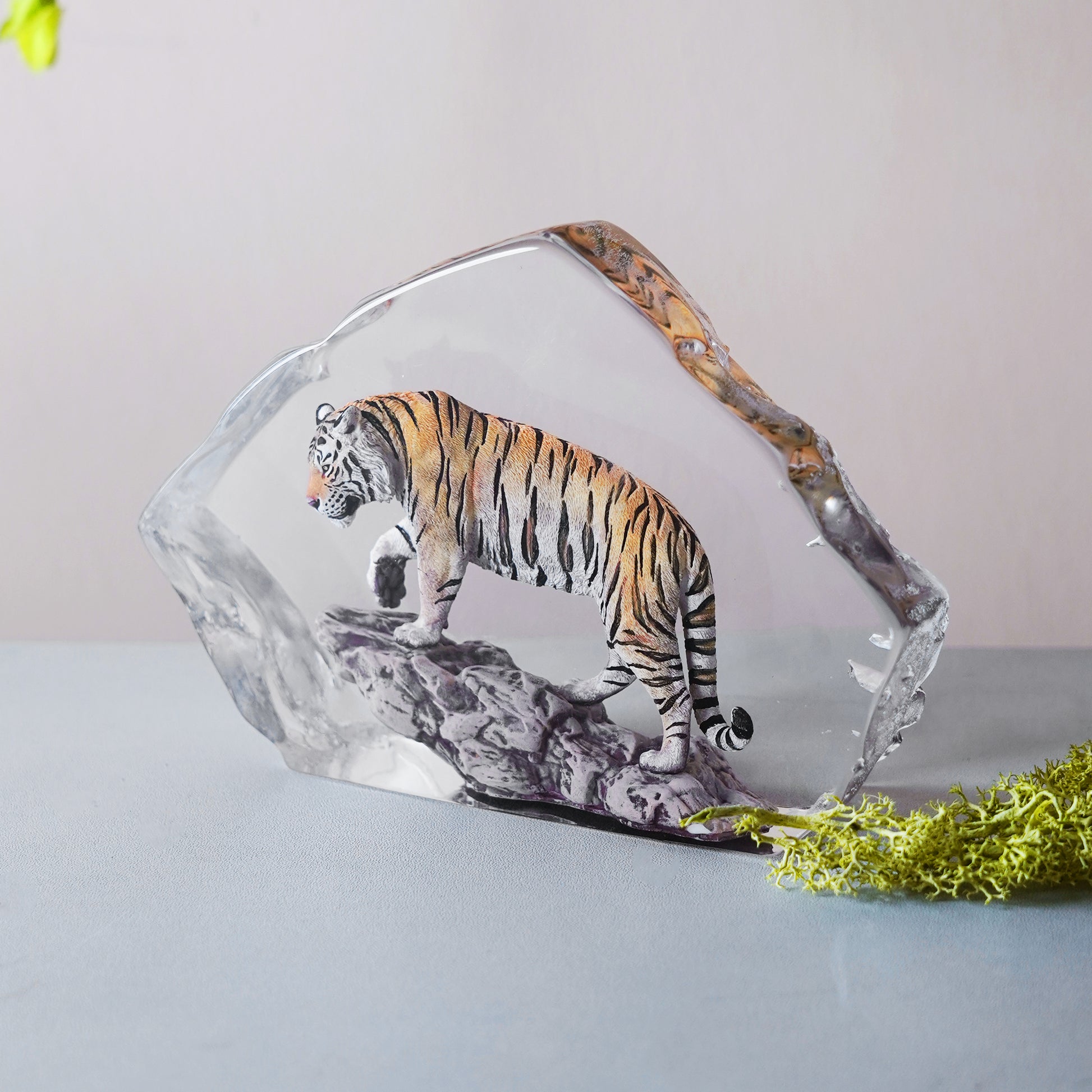 Blending nature-inspired artistry with modern design, this safari miniature home accent creates a stunning focal point. The contrast between the rugged rock and the sleek acrylic enhances the dynamic presence of the tiger, symbolizing strength, courage, and leadership. Perfect for animal lovers, collectors, or as a statement decor piece, this unique artwork brings the spirit of the wild to desks, shelves, or living spaces, making it a striking addition to any home.