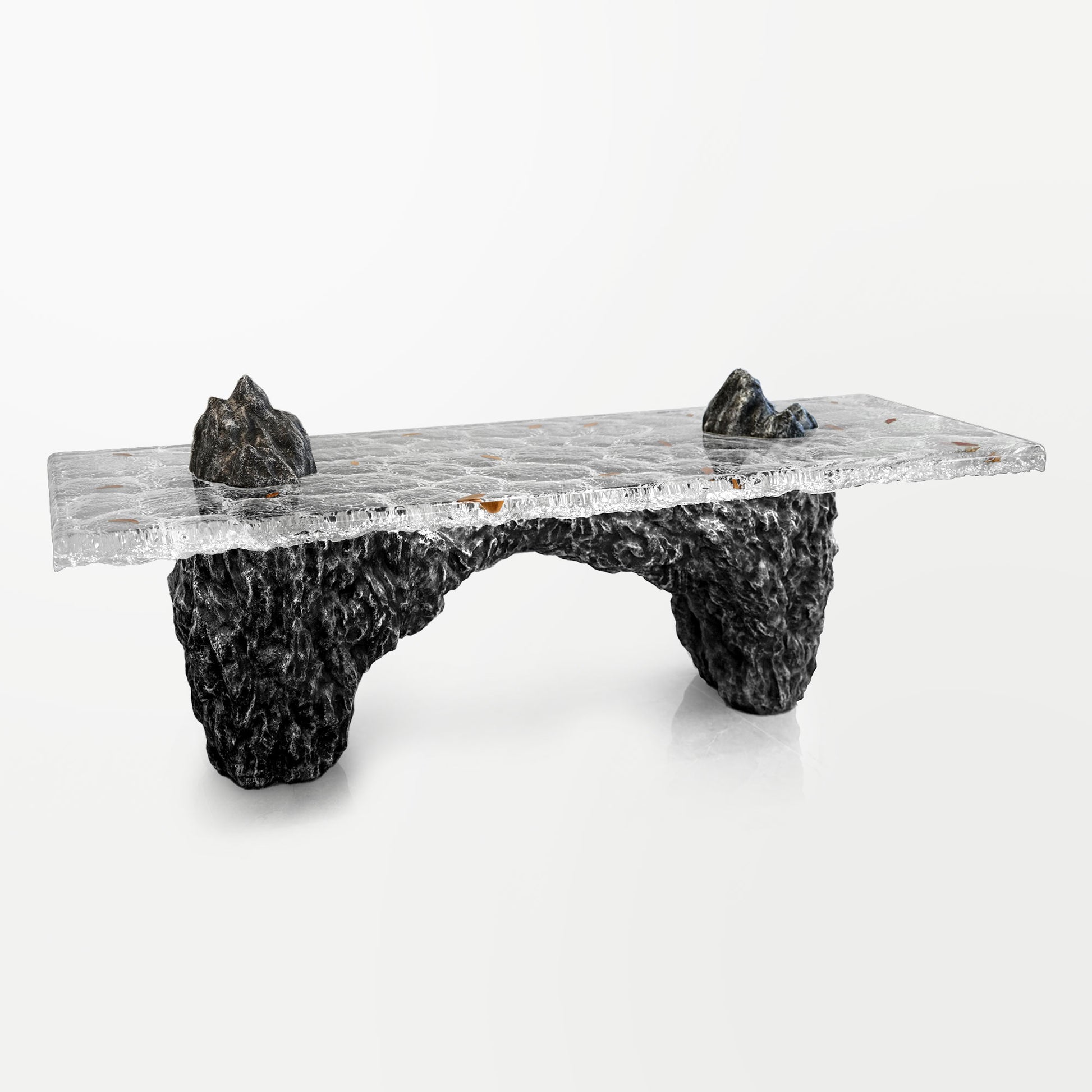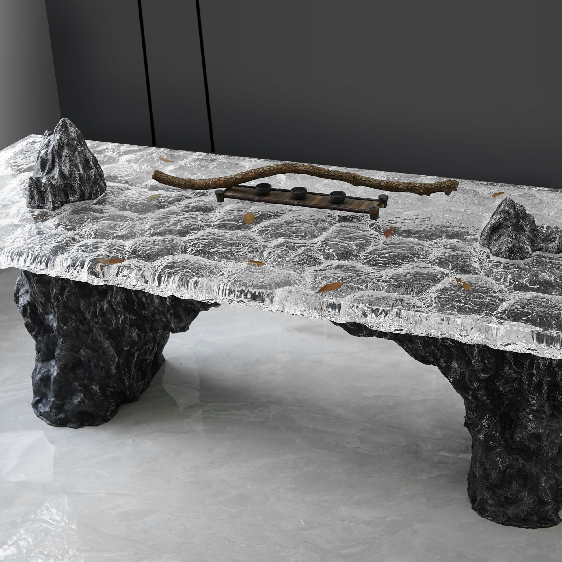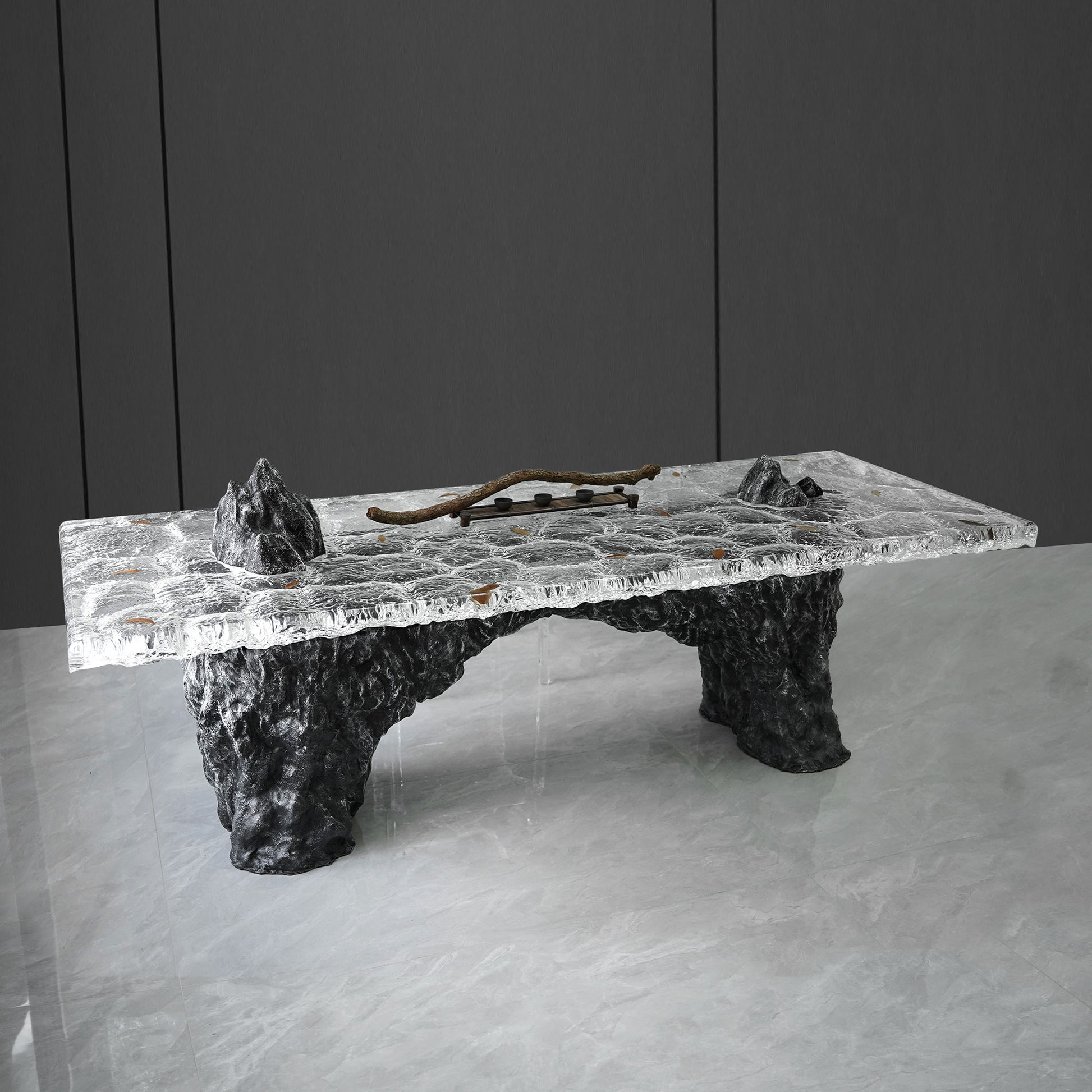 Bring the majesty of nature’s wild beauty into your home with the Volcanic Ridge Table—a sculptural piece that blends Zen philosophy with modern design. Inspired by the mountain‑stream landscapes found in Asian art, this table features two bold volcanic peaks rising through a textured clear top, evoking the serenity of flowing water and the grandeur of distant mountains. Real leaves are embedded within the acrylic, capturing the poetic moment of drifting autumn foliage and adding a meditative presence to the design.